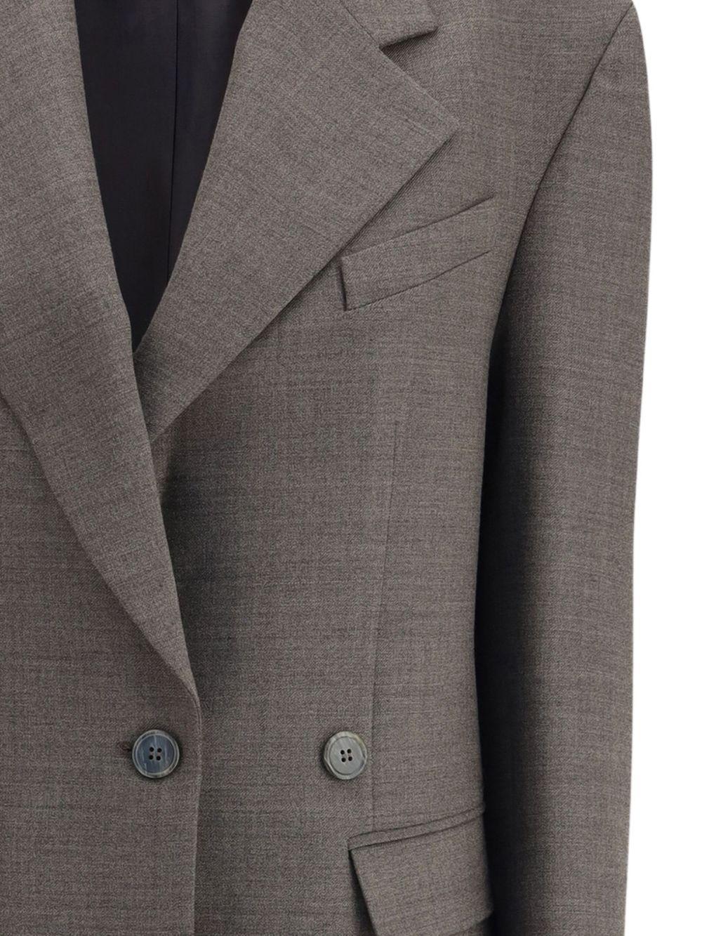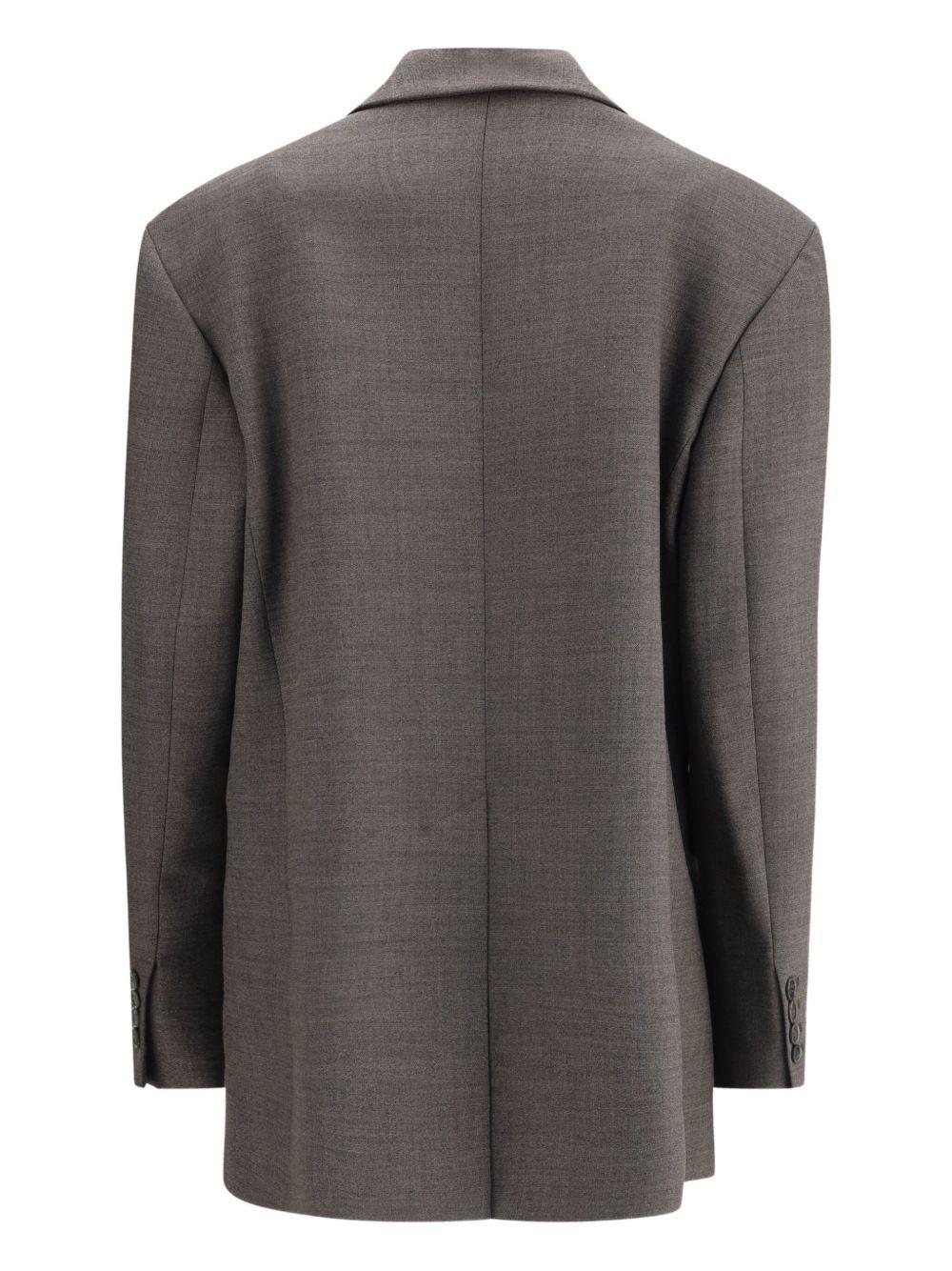 - Chiusura doppiopetto, rever a lancia; Maniche lunghe, tasche con patta frontali, tasca a filetto sul petto, Polsi con bottoni, Spacco centrale posteriore