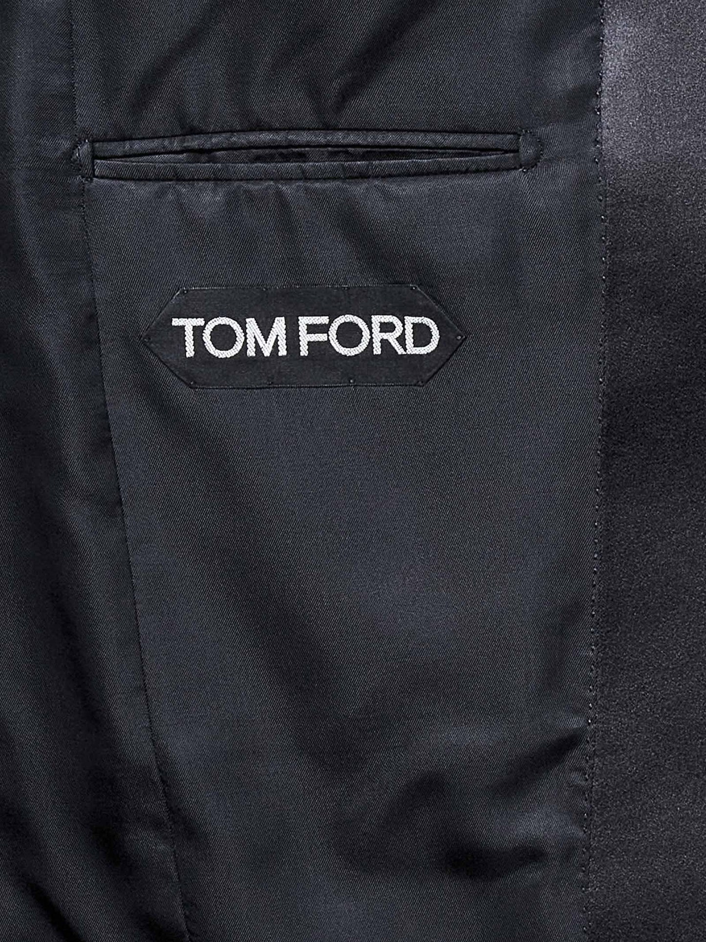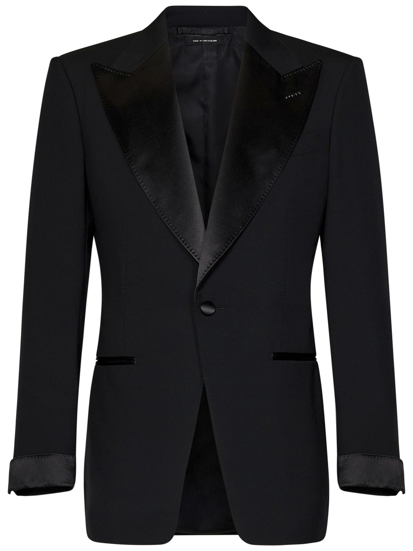 - Blazer: Single breasted, one button front closure; Satin peak lapel; Long sleeves, structured shoulders, five button cuffs, satin turn-up at sleeve cuff; Front welt pockets with satin piping, breast pocket; Center back vent; Satin covered buttons; Lined