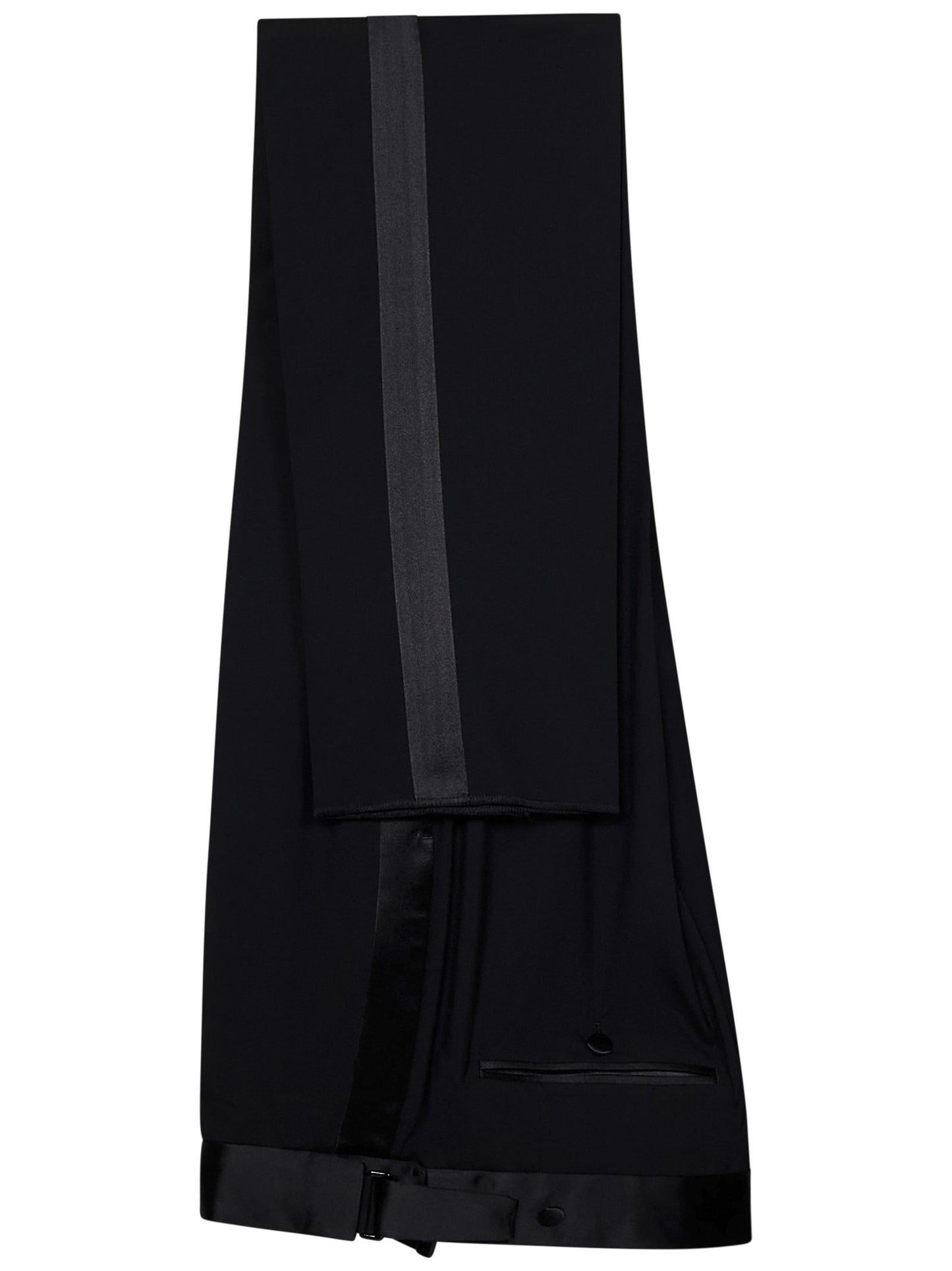 - Pants: Covered front closure, Extended satin waistband with covered closure, Adjustable side satin waist tabs with metal buckle and satin buttons; Satin side bands; Side seam pockets, Back welt pockets with satin piping and button; Ironed center pleat on front and back