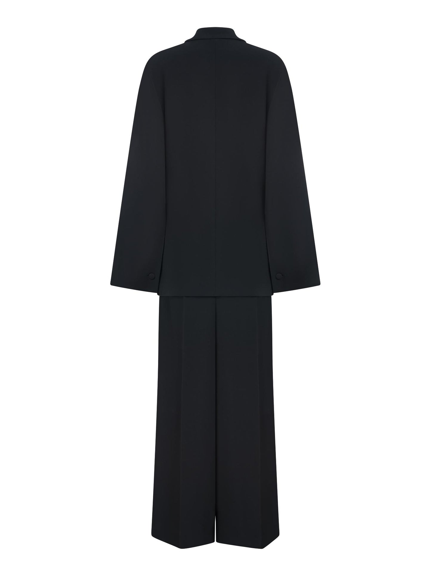 - Pantaloni: chiusura frontale coperta; vita alta; tasche laterali, tasca posteriore a filetto; doppia pince frontale; piega centrale stirata sulle gambe; gamba dritta; vestibilità regolare