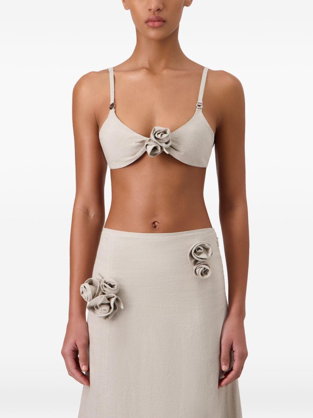 - Arricciatura centrale sul davanti con petali 3D in tessuto tono su tono