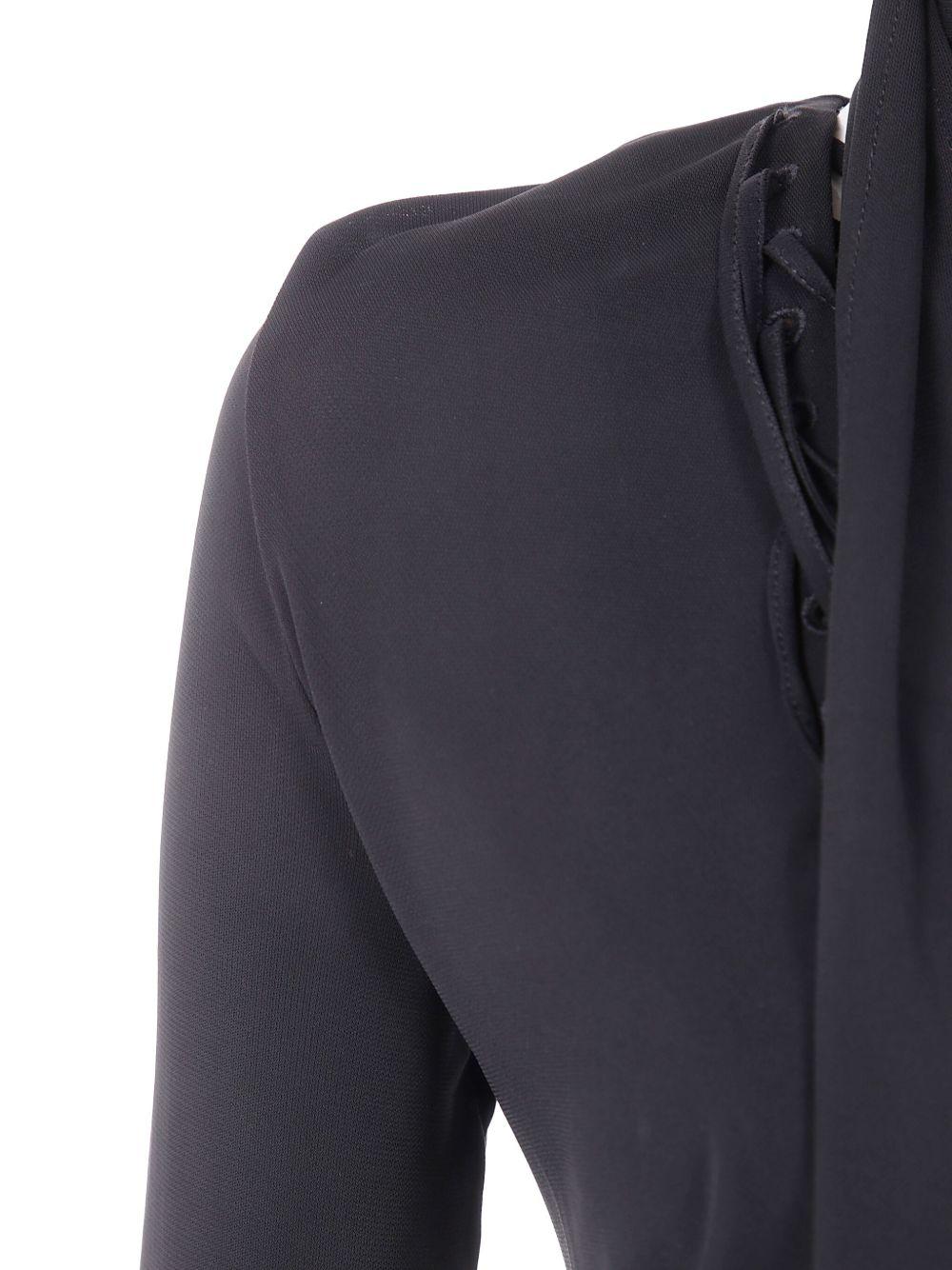 - Profondo scollo diagonale sul davanti con laccetti incrociati regolabili; collo lavallière regolabile