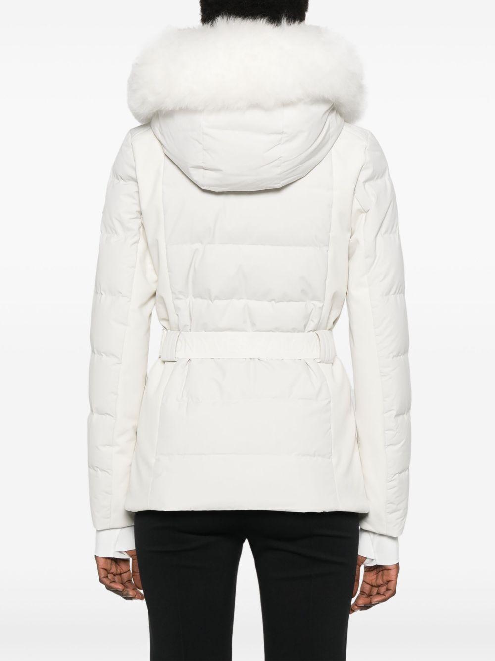 - Cappuccio con bordo in pelliccia di agnello a pelo lungo tono su tono; maniche lunghe, polsini con ghette elasticizzate con foro per i pollici