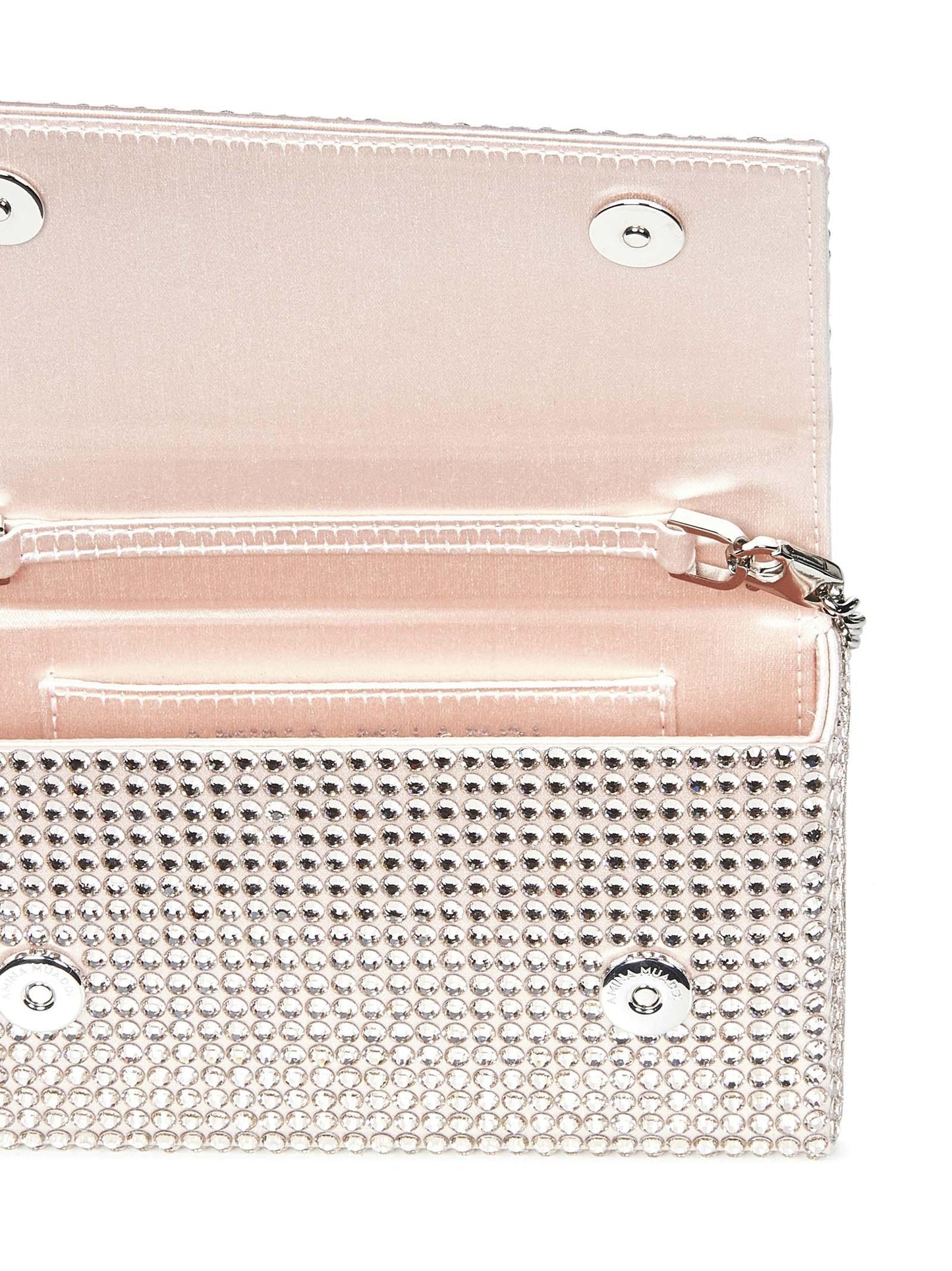 - Interior: one main compartment, one flat pocket, crystal logo; satin lining