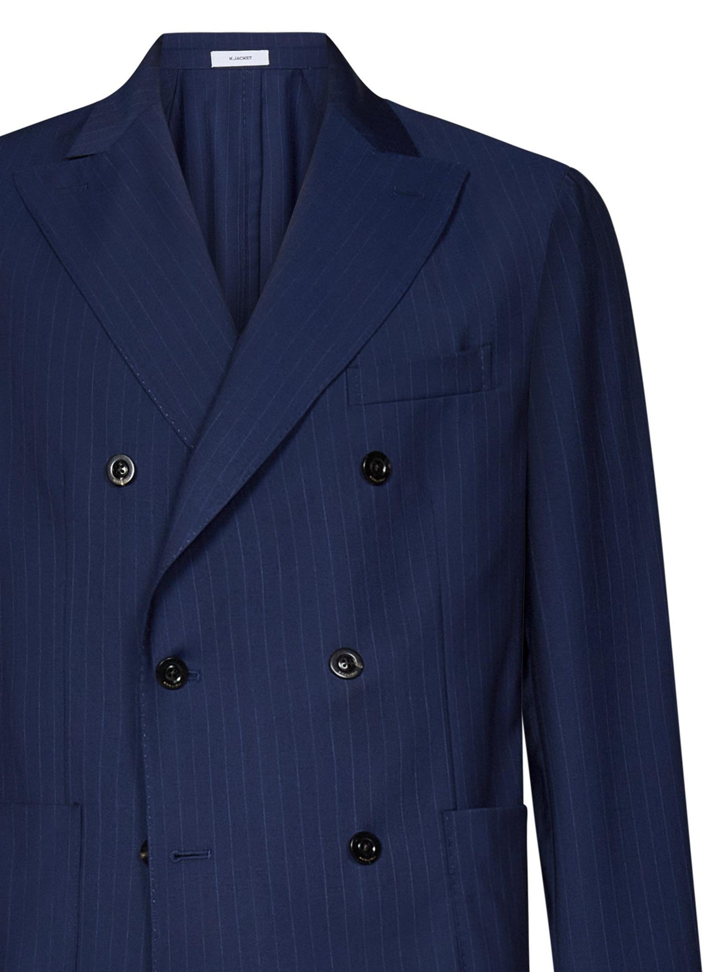 - Blazer: Double-breasted closure; Peak lapel; Long sleeves, buttoned cuffs; Front patch pockets, chest pocket, internal pockets; Side slits on the back; Unlined and deconstructed