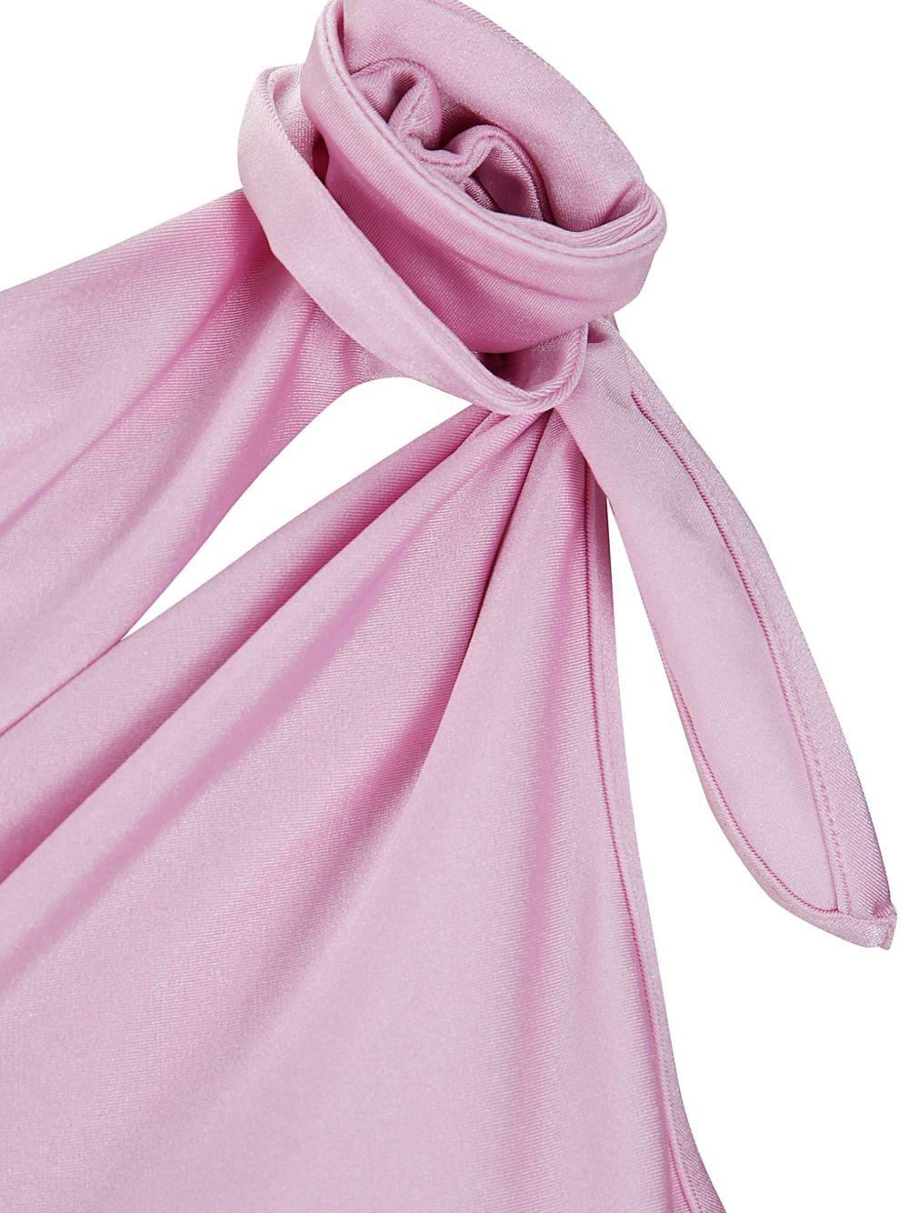 - Dettaglio cut-out diagonale sul davanti; dettaglio fiori annodati sul davanti