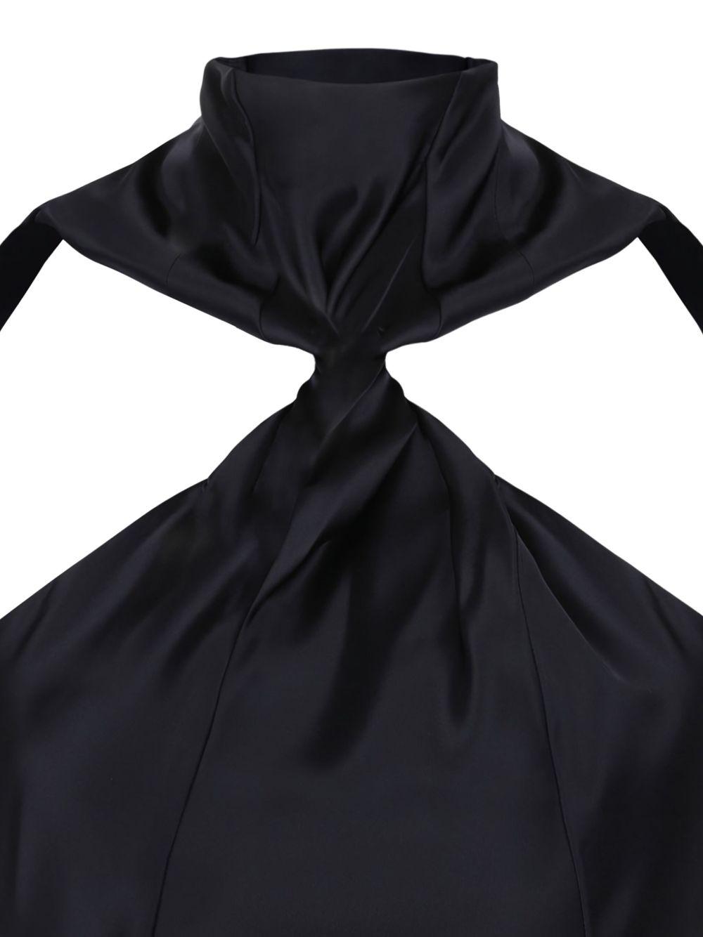 - Scollo all'americana con dettaglio attorcigliato sul davanti, collo in piedi; senza maniche