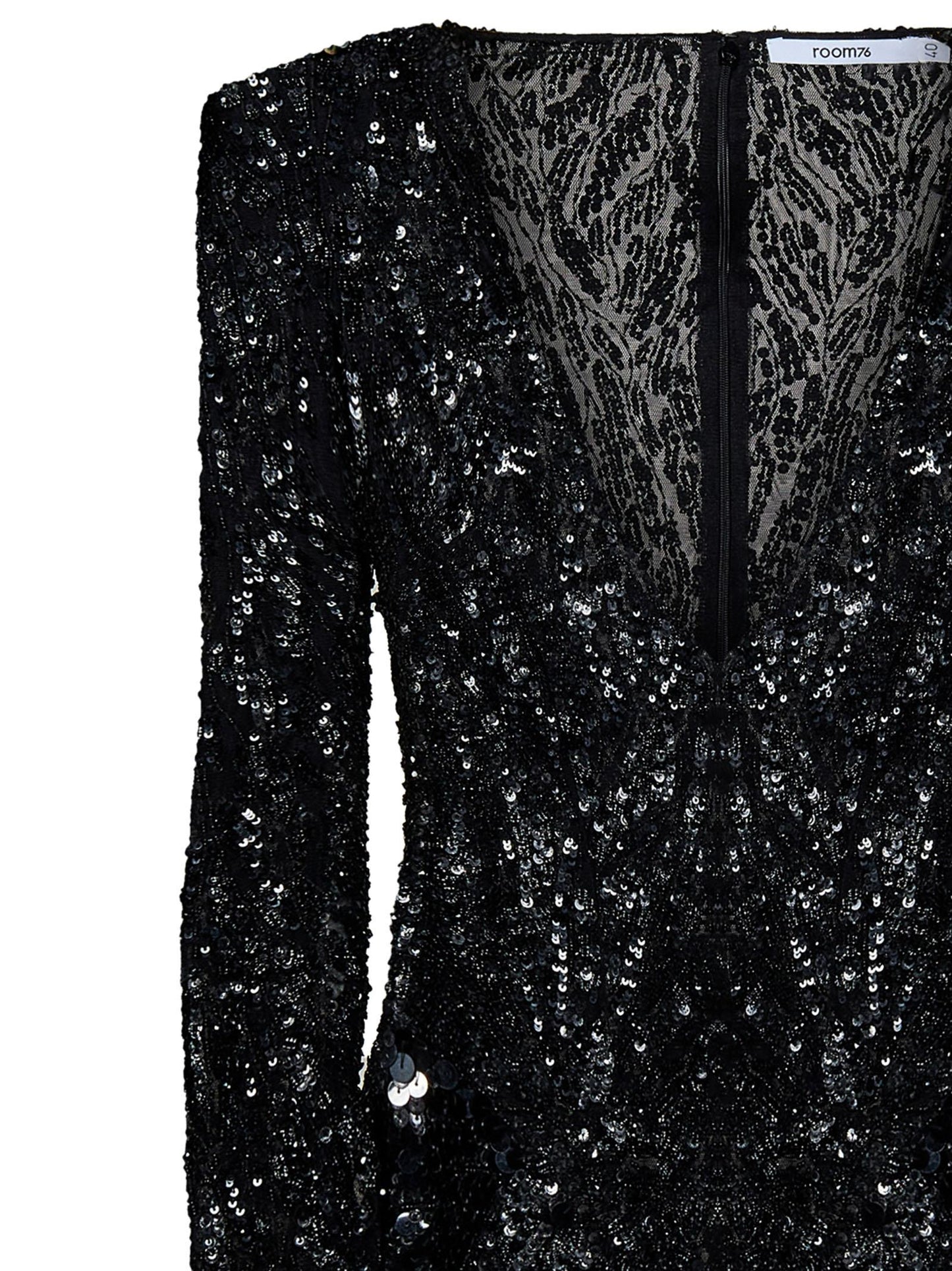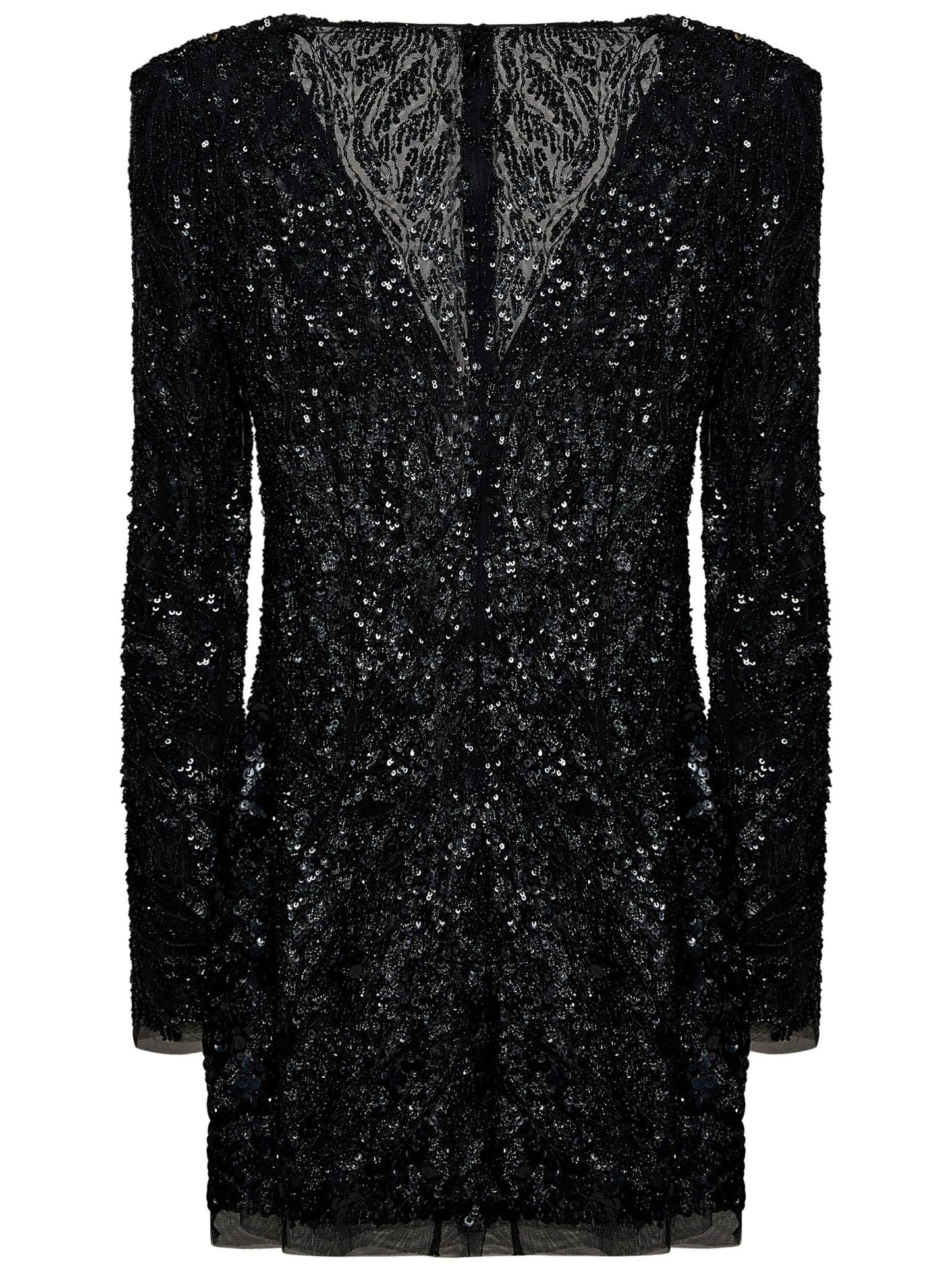 - Deep V-neck; Long sleeves, wide shoulders with padded shoulder straps