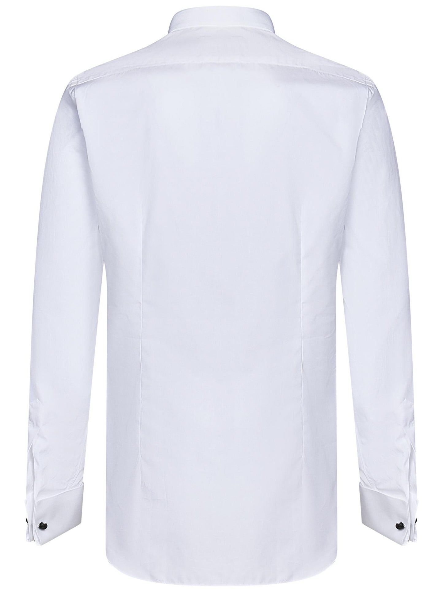 La sapiente lavorazione a mano, il pregiatissimo filato in cotone del cotonificio Albini, e i preziosi bottoni neri in madreperla rendono la camicia modello James Bond 007 di Franzese Napoli il fiore all'occhiello dei vostri look formali. Interamente made in Italy, è disegnata con il plastron a righe e un delicato ricamo "PER SEMPRE" sul polsino, per dire sì in grande stile.