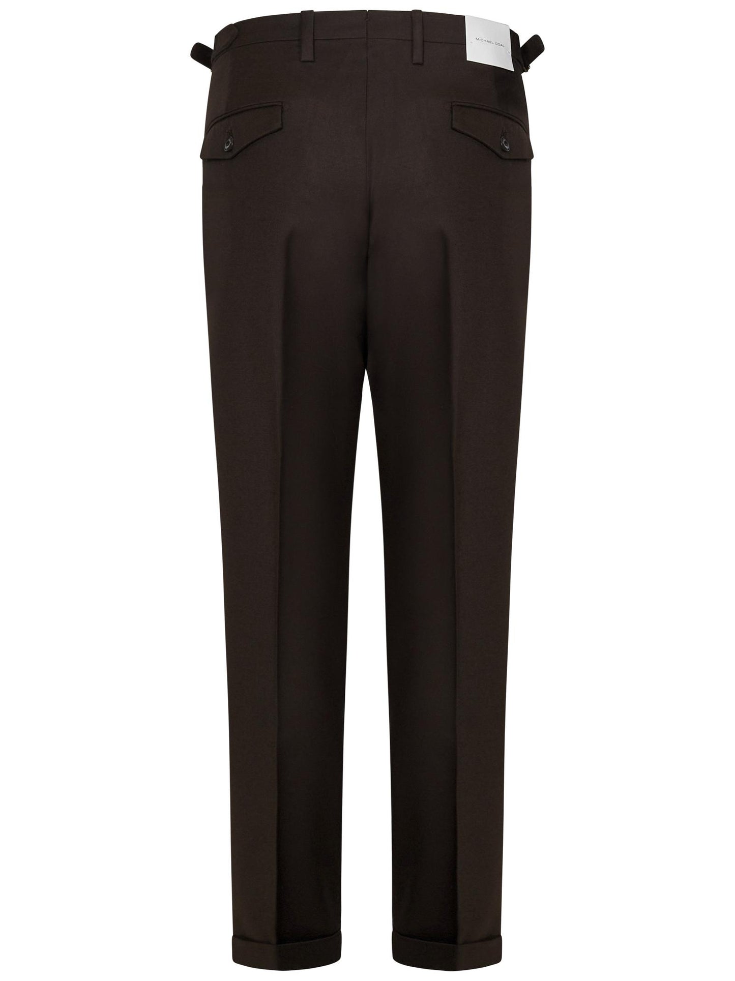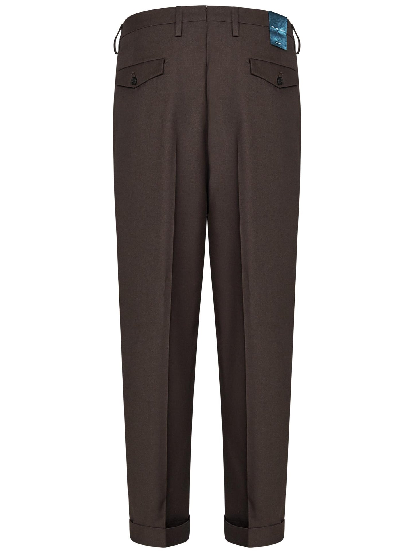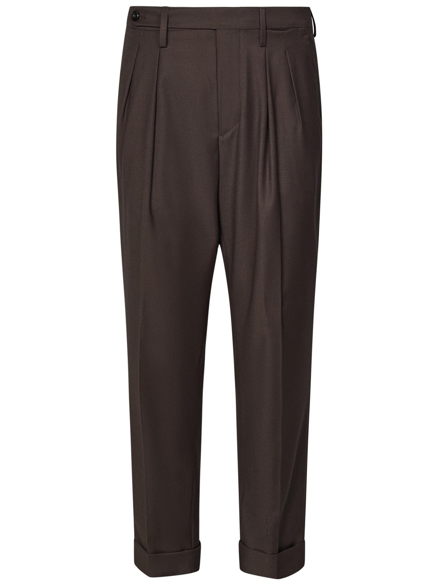 MC trousers in brown stretch viscose blend with double pleat and turn-up at the bottom.