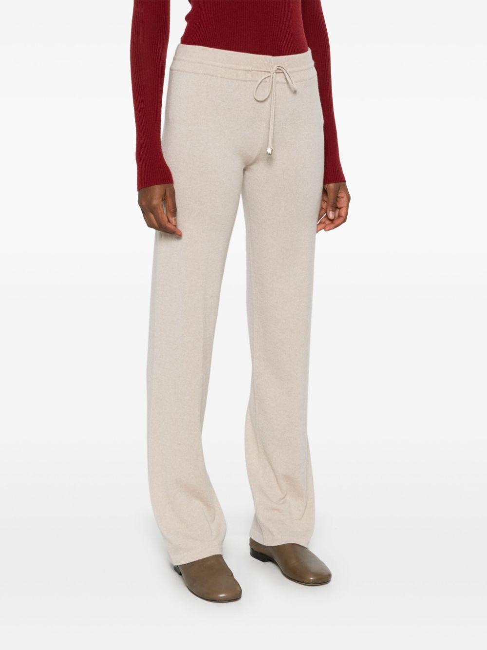 Comfy-chic jogger pants in light beige cashmere knit with drawstring waist.