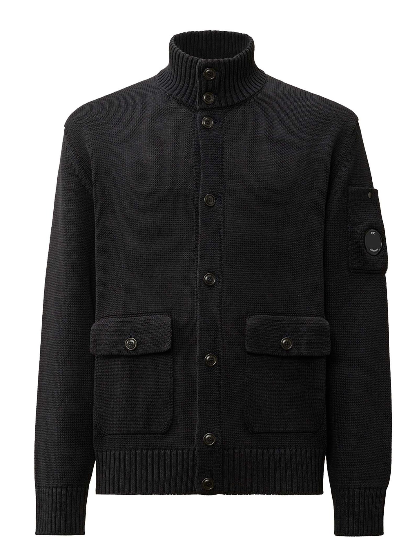 Navy blue lambswool and nylon blend cardigan with high collar and logo badge on the sleeve.