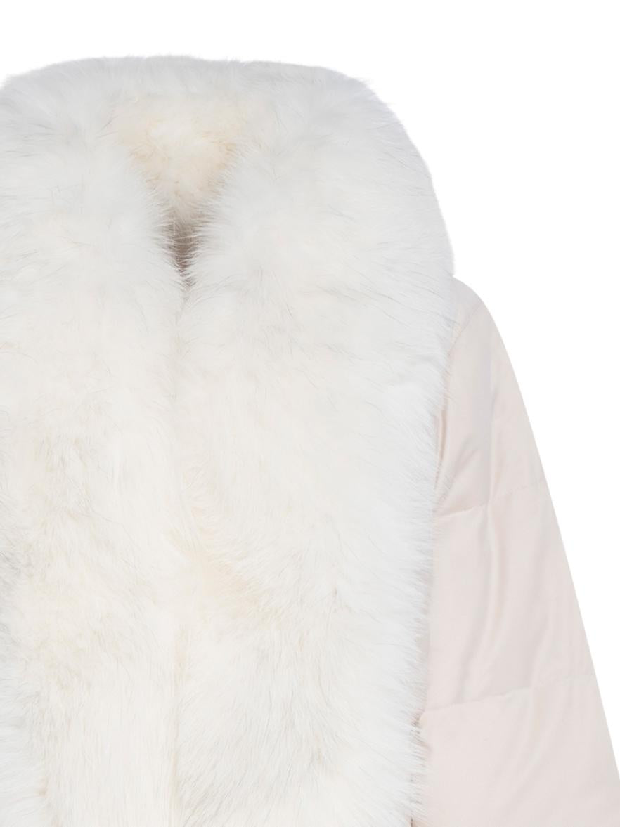 - Ampio collo rimovibile in pelliccia di volpe a pelo lungo tono su tono; maniche lunghe raglan