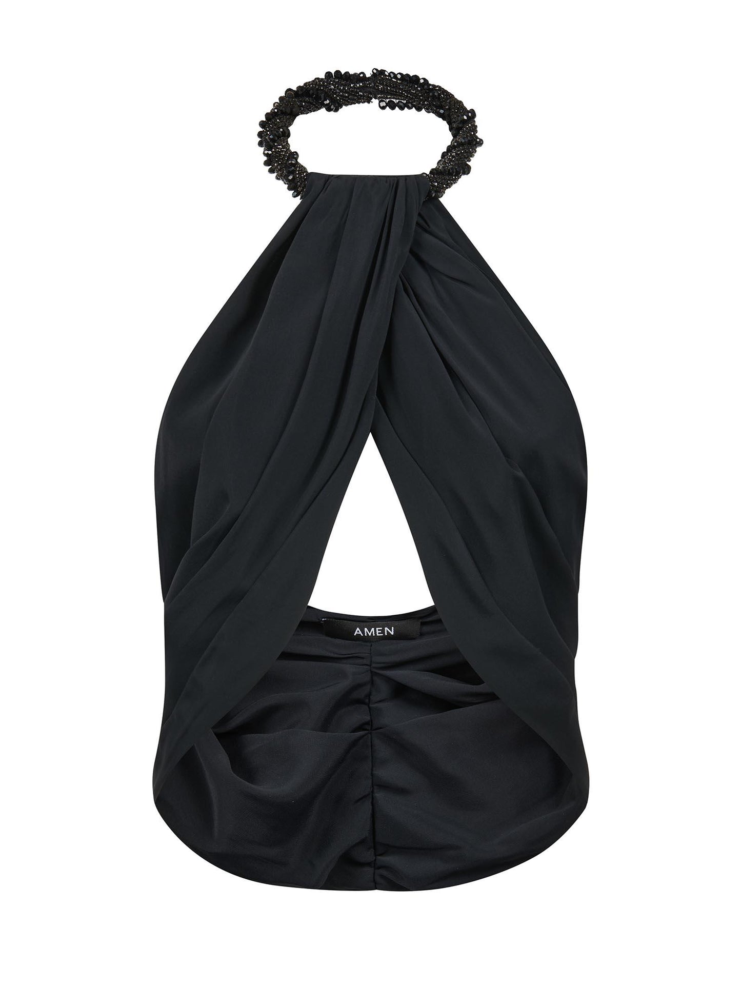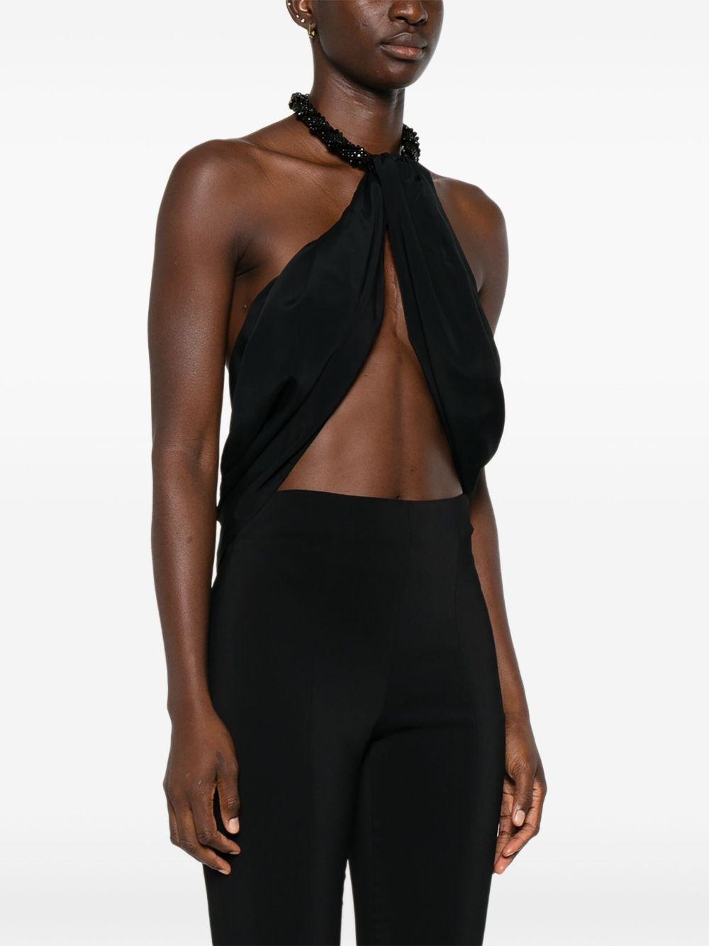 - Scollo all'americana con collana regolabile ricamata in perline tono su tono; dettaglio attorcigliato sullo scollo