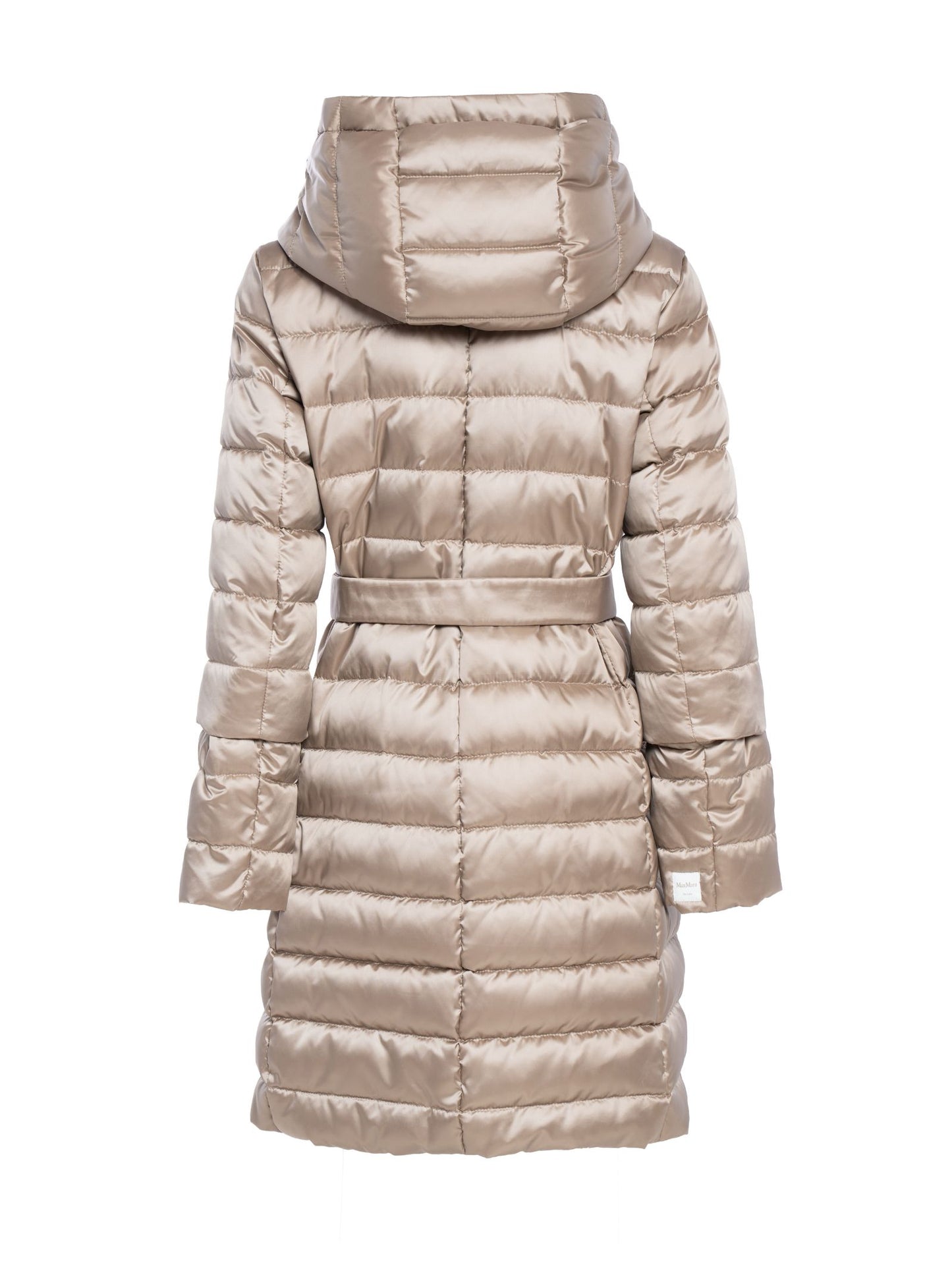 Piumino reversibile con cappuccio NOVEF in raso cangiante e taffetà liscio beige con due cinture.