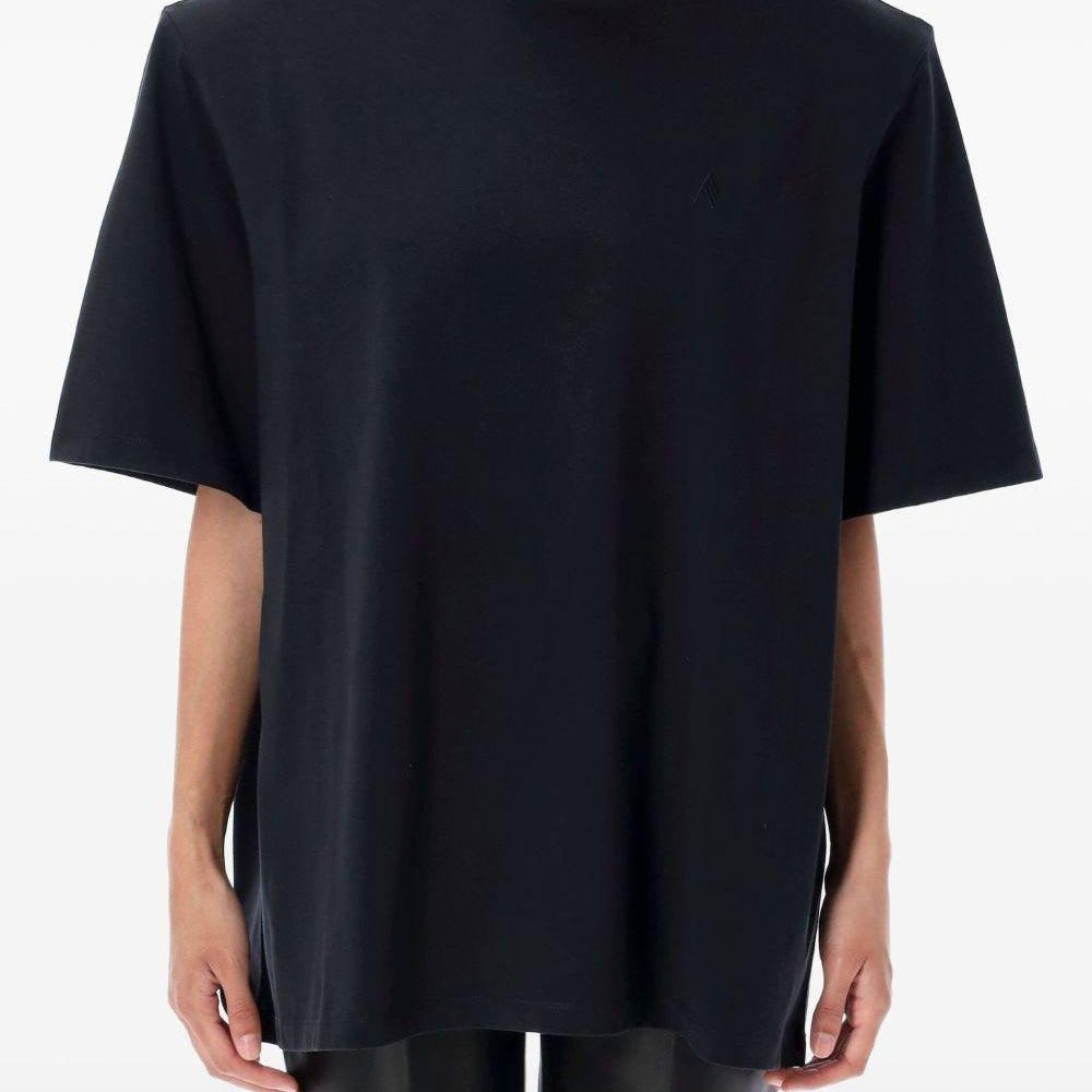 T-shirt oversize in cotone nero con spalline imbottite e ricamo logo sul petto.