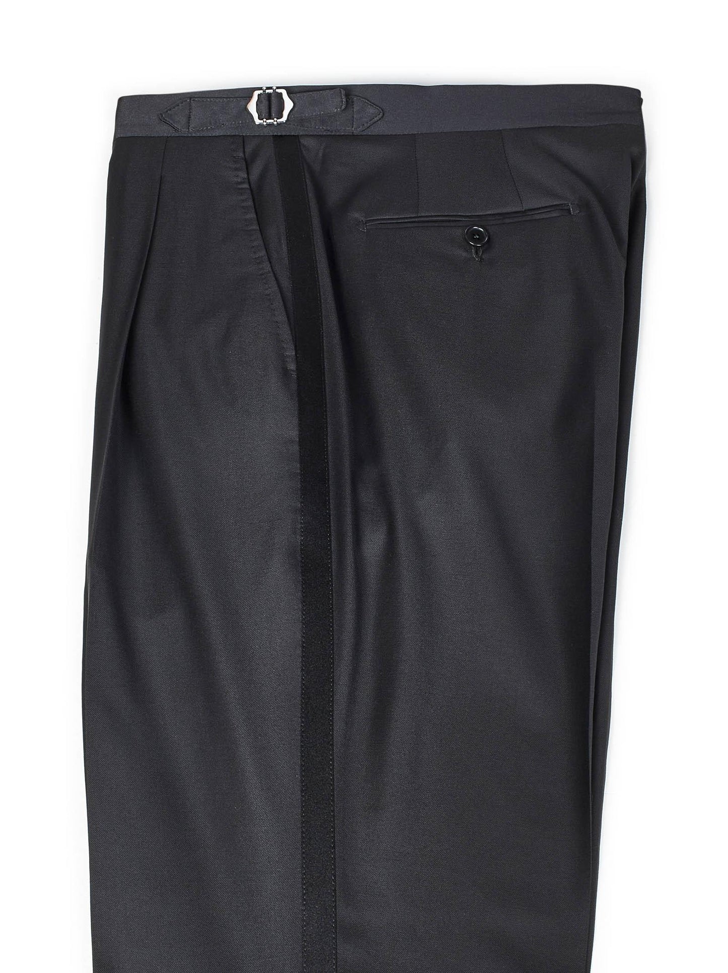 - Chiusura frontale nascosta con bottone e zip nascosta, vita in satin di seta, cinturini laterali alla vita, pinces singola, tasche america laterali, tasche a filetto con bottone sul retro, piega centrale stirata, bande laterali in satin di seta