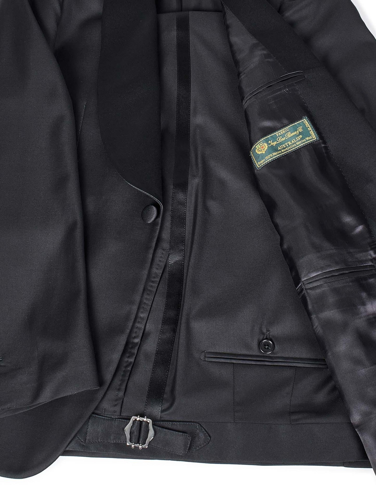 - Chiusura monopetto a un bottone, ampio rever a scialle in satin di seta, tasche frontali con patta, taschino a filetto sul petto, polsi con bottone, asola realizzata a mano, bottoni rivestiti in satin di seta