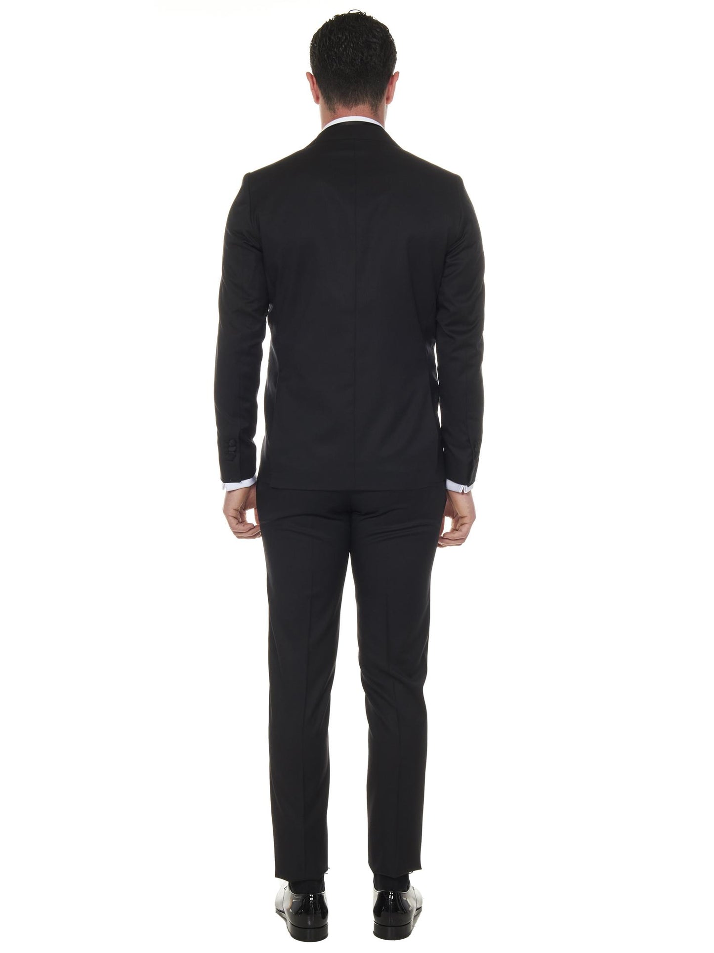 Il massimo dell'eleganza espresso attraverso il tessuto in tasmanian 170S e seta e la confezione interamente sartoriale made in Italy per l'abito smoking James Bond 007 di Franzese Napoli. Disegnato con blazer monopetto con rever a lancia in raso impunturato a mano, il raffinato panciotto e i pantaloni dal taglio slim.