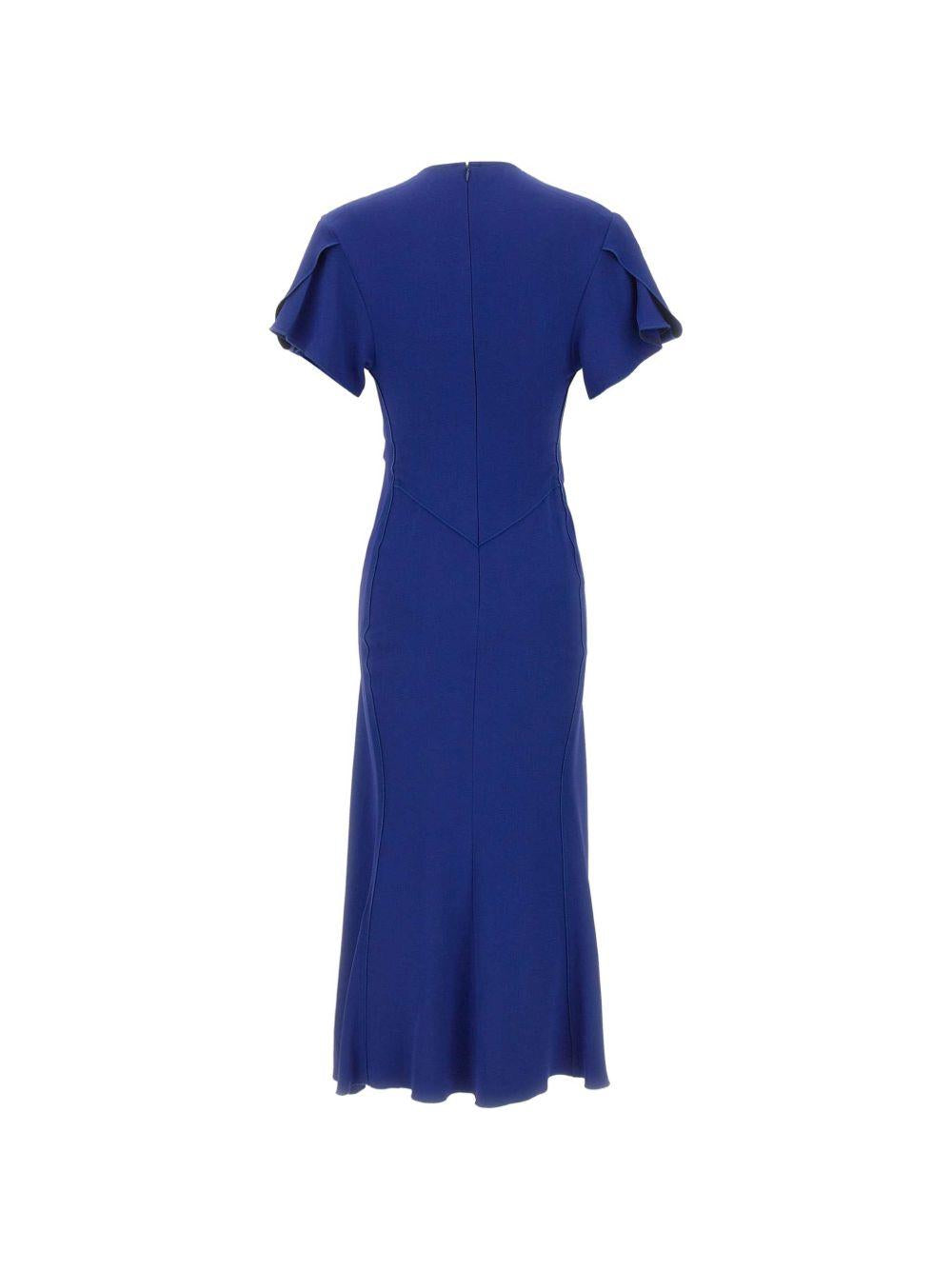 - Scollo a V; maniche corte drappeggiate a pannelli
