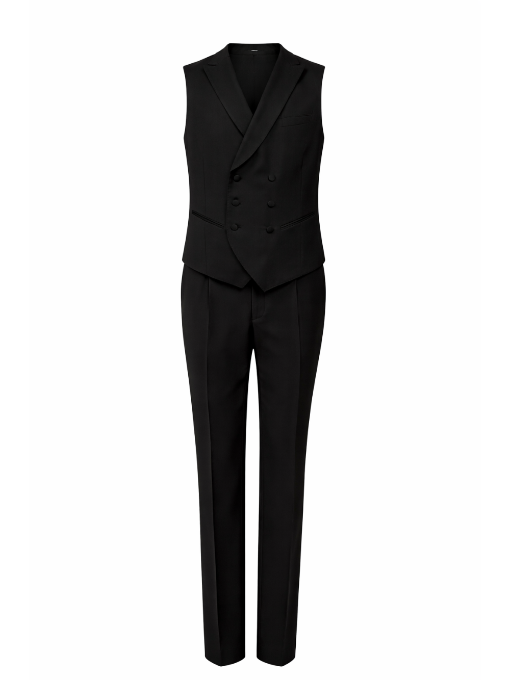 - Panciotto doppiopetto a sei bottoni, tasche laterali a filetto, cinturino con fibbia sul retro