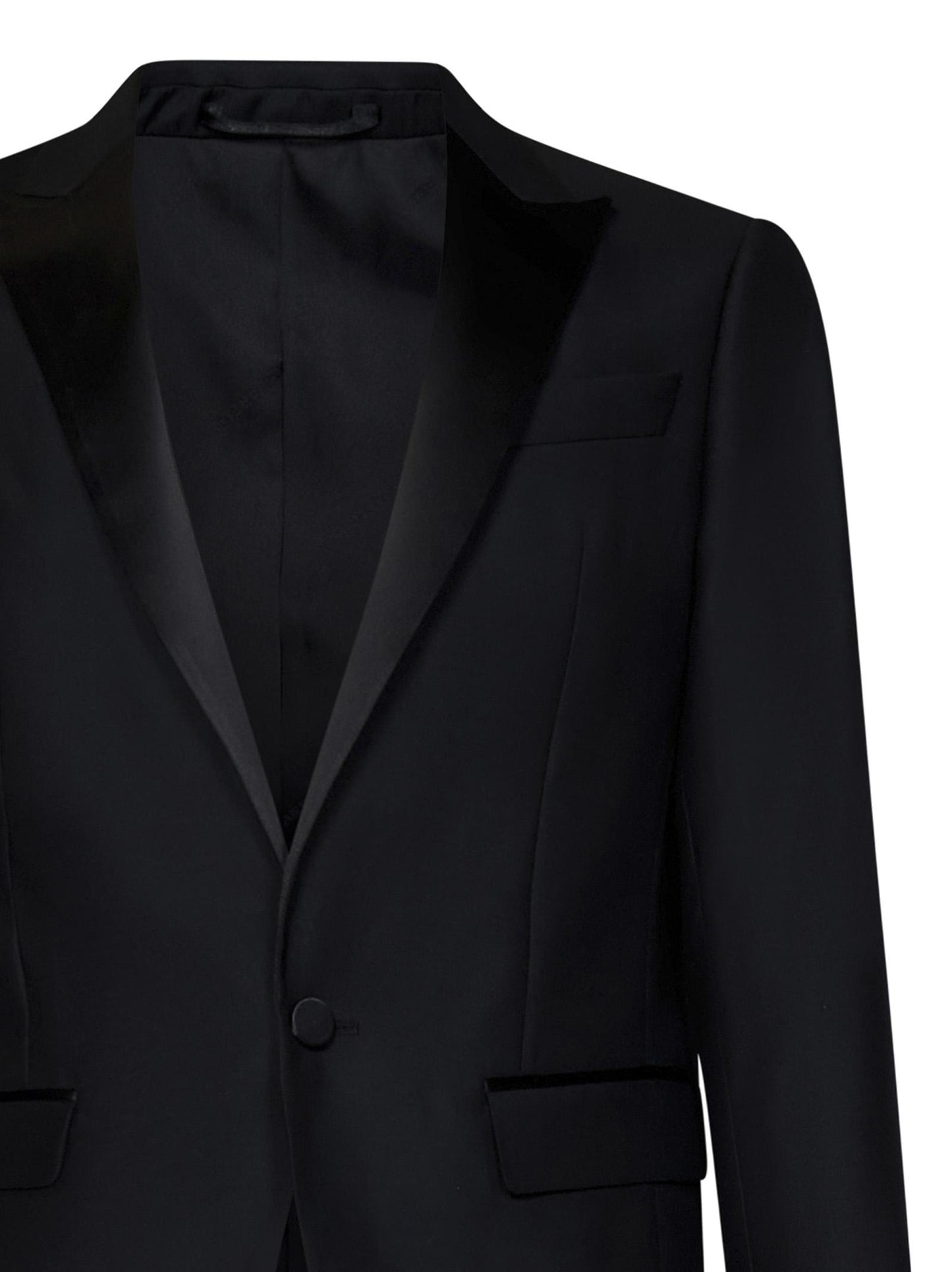- Blazer: Monopetto, chiusura frontale a un bottone; Rever a lancia in raso di seta tono su tono; Maniche lunghe, spalle strutturate, polsini a quattro bottoni; Tasche frontali a filetto con piping in raso di seta, taschino sul petto; Spacco centrale sul retro; Bottoni rivestiti in raso di seta tono su tono; Foderato