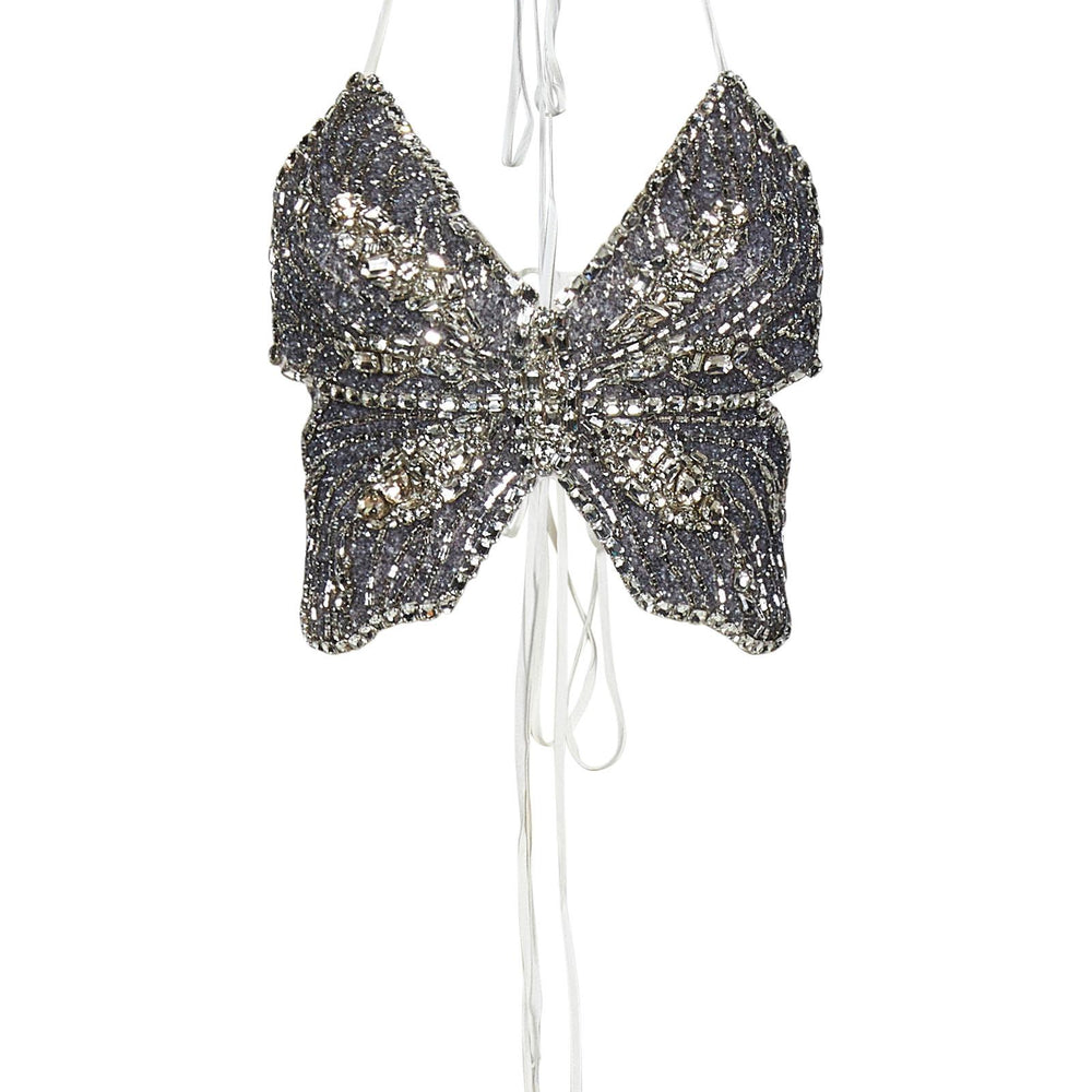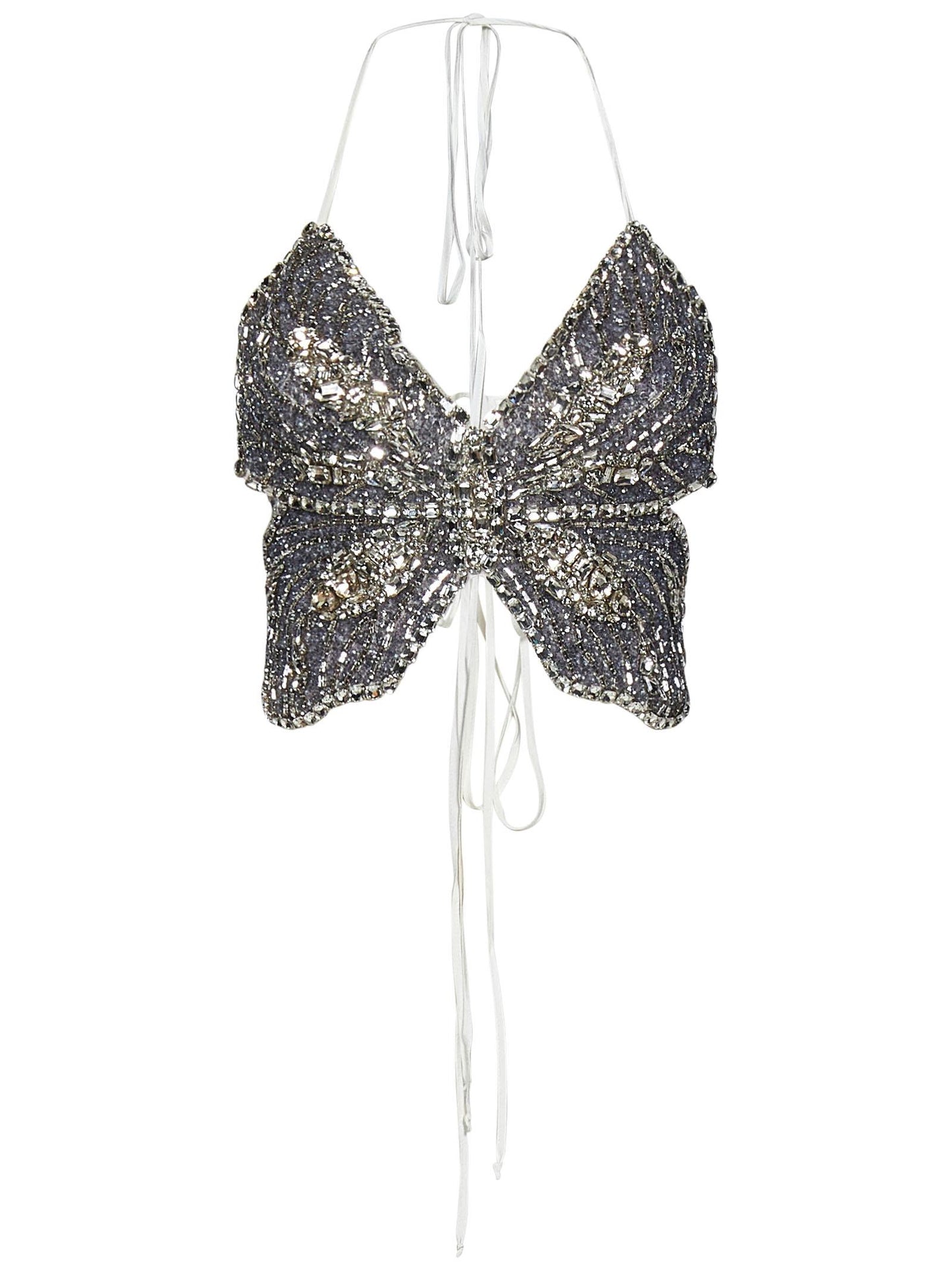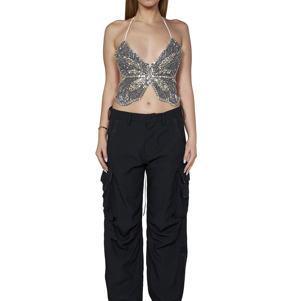 Top lavallière in viscosa e seta jacquard V Allover nera con scollo all'americana.