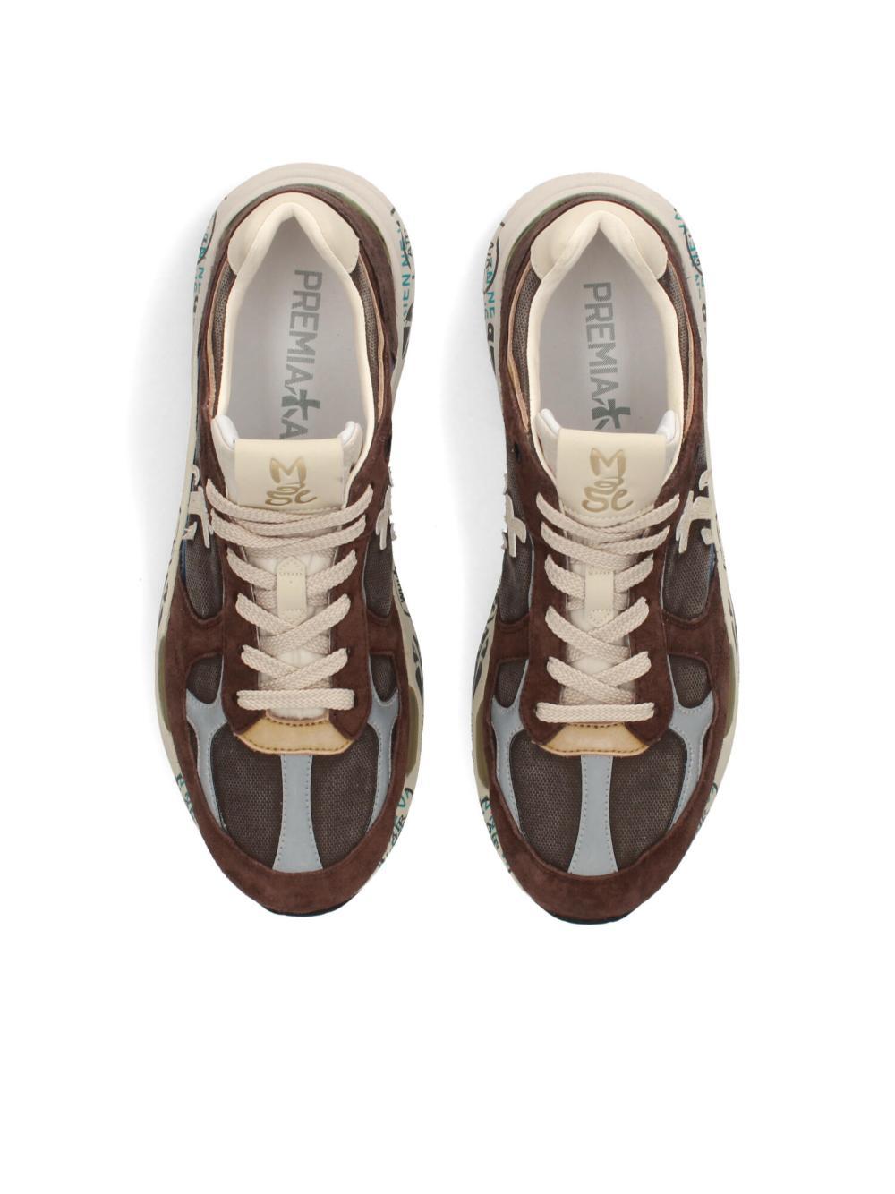 - Tomaia in mesh e suede marrone con dettagli multicolor a contrasto