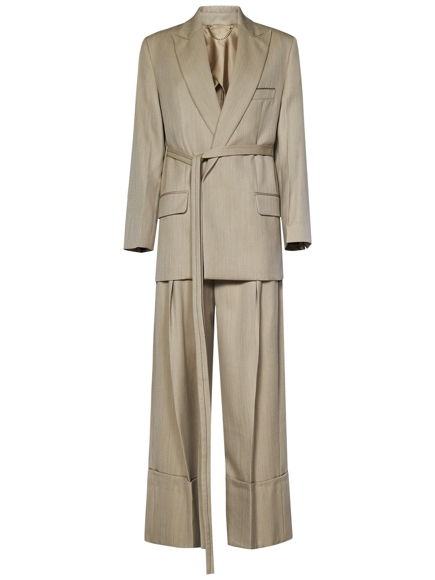 - Blazer: chiusura doppiopetto coperta; rever a lancia; maniche lunghe, spacco sul fondo manica; cintura integrata coordinata regolabile in vita; tasche in vita a filetto con pattina, taschino sul petto; mezza fodera