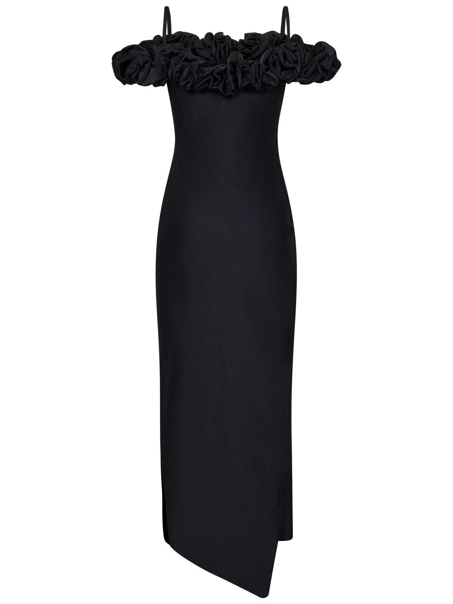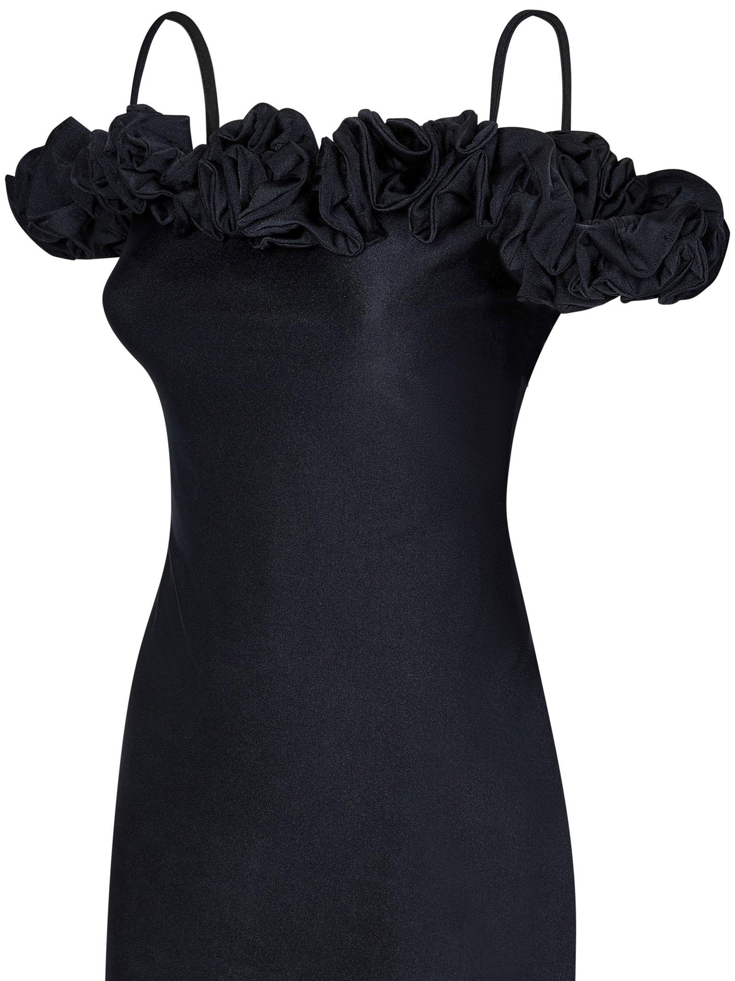 - Scollo con spalle scoperta, spalline sottili; ruches floreali tono su tono sullo scollo